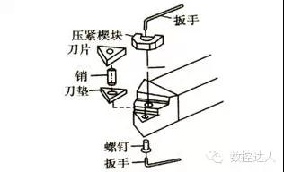 三、机夹车刀 机夹车刀是采用普通刀片,用机械夹固的方法将刀片夹持在刀杆上使用的车刀。此类刀具有如下特点:(1)刀片不经过高温焊接,避免了因焊接而引起的刀片硬度下降、产生裂纹等缺陷,提高了刀具的度。 (2)由于刀具度提高,使用时间较长,换刀时间缩短,提高了生产效率。 (3)刀杆可重复使用,既节省了钢材又提高了刀片的利用率,刀片由制造厂家回收再制,提高了经济效益,降低了刀具成本。 (4)刀片重磨后,尺寸会逐渐变小,为了恢复刀片的工作位置,往往在车刀结构上设有刀片的调整机构,以增加刀片的重磨次数。 (5)压紧刀片所用的压板端部,可以起断屑器作用。