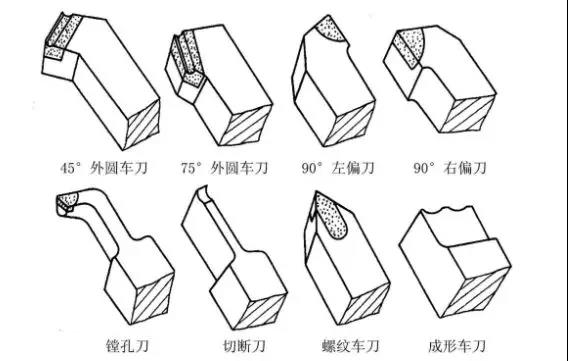 (1)粗车刀:主要是用来切削大量且多余部份使工作物直径接近需要的尺寸。粗车时表面光度不重要,因此车刀尖可研磨成尖锐的刀峰,但是刀峰通常要有微小的圆度以避免断裂。