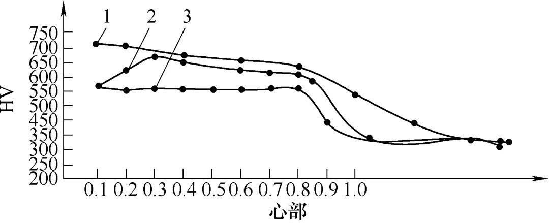 感应加热的方式和传统回火加热的方式有些本质的不同,即感应加热是感应涡流使钢的表面自体发热加热,时间短;传统回火加热是外部发热体通过热传导和辐射进行加热,时间长,有足够的时间使热量在钢内部传导并使温度均匀。为了检查整个硬化层的回火程度,对感应回火后的零件进行硬度梯度的测定,以反映感应回火时感应涡流透入加热效果。硬化层梯度测定,如图2所示。