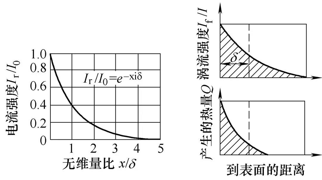 图3表明涡流强度随表面距离变化的关系。涡流分布是高度集中在零件的表面中,而且涡流强度随距离增大而急剧下降,随距离的e指数比下降的。实际应用中,规定Ir下降到Io的36.79%为电流透入,同时可近似认为涡流只存在于零件表面电流透入的薄层中,而在薄层以内的心部没有涡流。由于涡流产生的热量与涡流强度的平方成正比,所以从表面向心部,热量的下降要比涡流下降的快。
