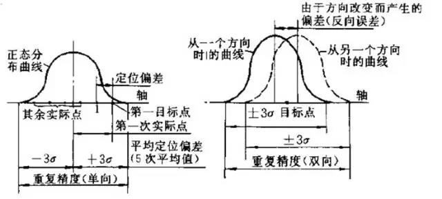 轴向重复精度指目标点处一条正态曲线大展宽(单向)或两条正态曲线(双向)之和的大展宽。一个简单的理解:重复精度大约为定位精度的½,但也有例外,并且有时出进还很大。图3中目标点的正态曲线旋转了90°,目的是为了加直观地表达展宽的概念。由于这种分析方法基于差的定位精度情形,并且几乎覆盖100%的可能的不正确性,因此可以期看用它能较好地评价数控机床的实际性能。