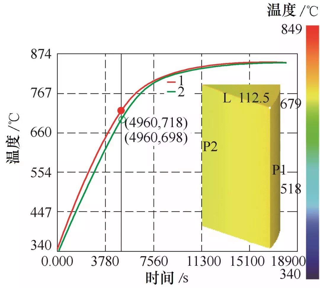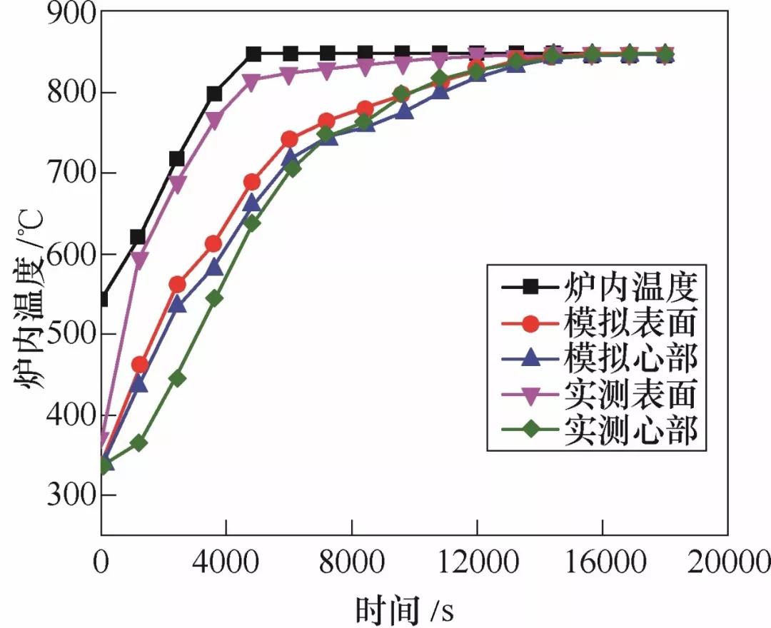 十字轴装入加热炉内加热保温(见图3),在其心部插入一支热电偶,石棉堵塞通孔。靠近十字轴表面粘贴了一支热电偶,测其表面温度。加热保温温度850℃,保温时间以实测心部到温后结束。十字轴加热过程模拟见图4。