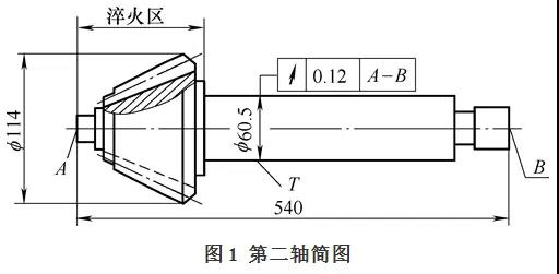 我公司生产的东方红-75型拖拉机轴齿轮(图1,简称轴),材料为20CrMnTi钢,重量16.3kg,热处理技术要求:齿面和心部硬度分别为56~63HRC和>25HRC,渗碳层1.3~1.8mm,马氏体及残余奥氏体1~5级,碳化物1~5级,心部铁素体1~5级,T面圆跳动≤0.12mm,其余≤0.15mm。