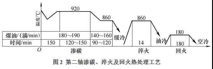 轴渗碳采用RQ3-9-9型井式气体渗碳炉,淬火采用RYD-100-8A型插入式电盐浴炉,回火常用RJ2-75-6型井式回火炉。轴渗碳、淬火及回火热处理工艺见图2。