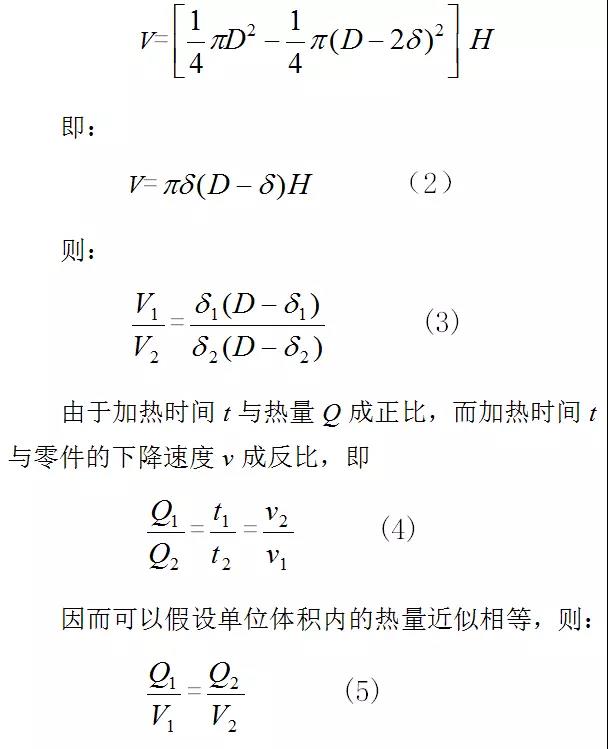 设零件的直径为D,当下降速度为v1时,硬化层为δ1,而当下降速度为v2时,硬化层深为δ2。根据前面所述,感应涡流绝大部分在以δ和H围成的圆筒内流过,其加热的体积为: