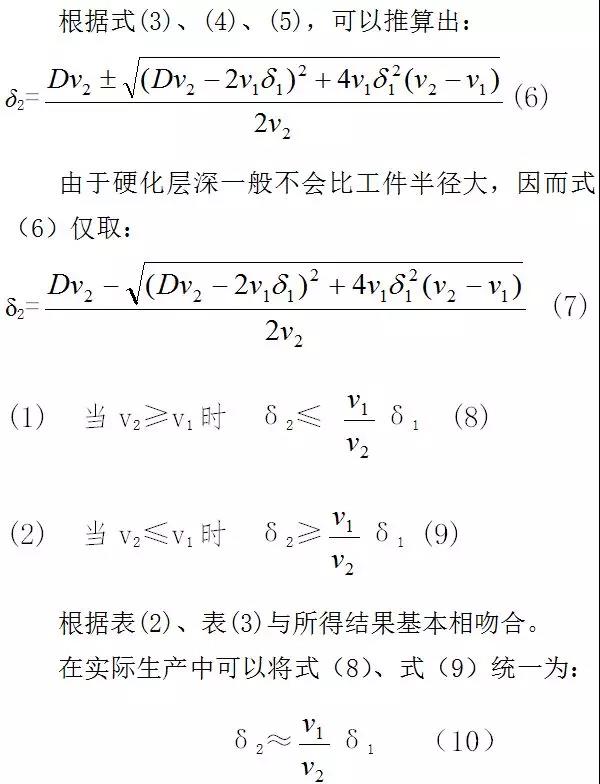 所以,在相同条件下,如果通过试验了v1和δ1的数据,就可以根据式(10)大致估算出:当零件下降速度发生变化后,零件中频淬火后的淬硬层。