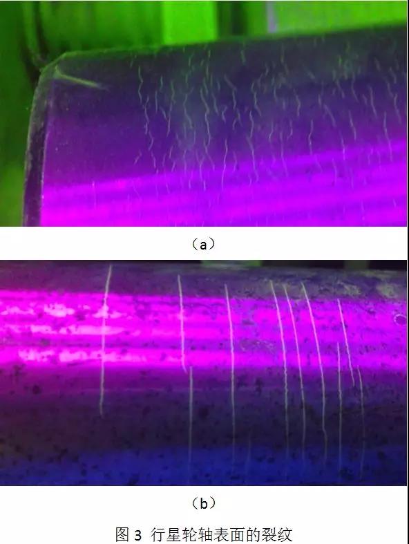 对失效的行星轮轴以及成品库房待用零件进行磁粉探伤检验,发现工件表面存在不同程度的裂纹,如图3所示。图3a裂纹成龟甲状,图3b裂纹方向沿周向平行扩展,且垂直于磨削方向。