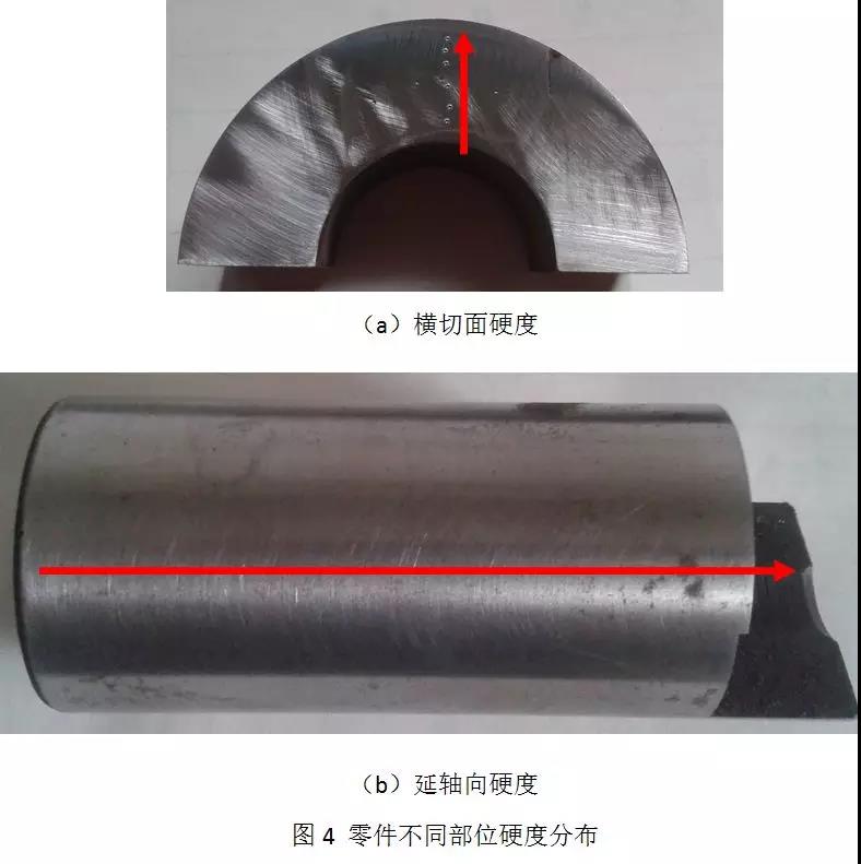 表1结果说明,经过冷加工磨削后零件表面硬度值均匀且偏上限,符合零件硬度要求。零件横切面硬度低点为48HRC,说明零件已淬透。