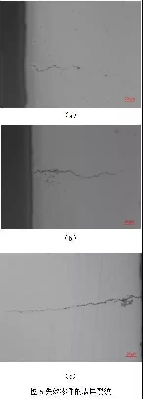 磨削裂纹是零件在淬火后精磨时,由于磨削表层的局部内应力(由淬火应力和磨削力共同决定)超过了材料的断裂限而产生的局部裂纹。磨削裂纹一般呈细密的且与磨削方向垂直的直线状分布,或以龟甲形状出现。虽然形态会有所不同,但磨削裂纹一般均存在于磨削表面较浅的范围内。本试验所观察到的表面裂纹大多起源于零件的磨削面,且裂纹较浅,在无损探伤检验以及热腐蚀后,表面裂纹形貌均符合磨削裂纹形貌情况。