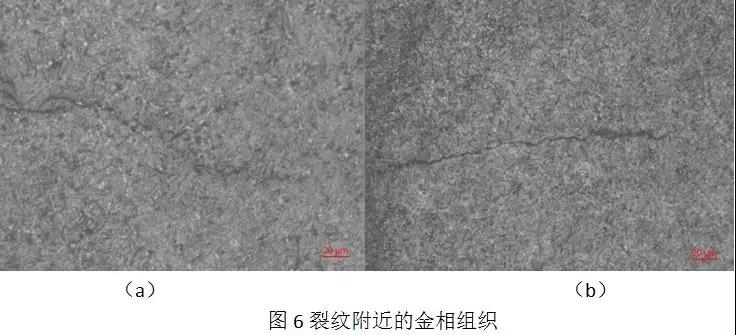 表层裂纹及形貌:在对失效零件进行金相分析时,发现了许多由表面向内延伸的表面裂纹,裂纹长度在0.15~0.20mm之间,裂纹垂直于表面向内延伸,见图5。裂纹末端尖锐,沿晶界扩展,且裂纹两侧无氧化、无脱碳。图5裂纹形貌曲折、间断,而且裂纹体的有些部位出现了分叉现象,说明淬火时存在较大的内应力(包括组织应力和热应力)。