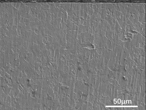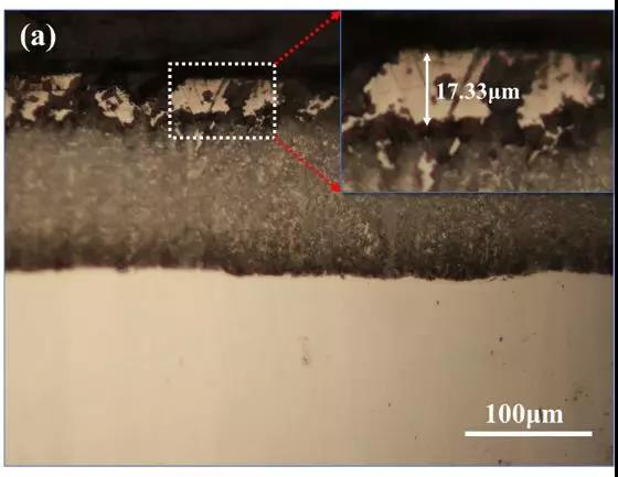 使用王水对不锈钢进行腐蚀,其结果如图2所示。未发现氮化层,结合其氮化后表面氧化现象,事后氨气成分检测,发现其水分严重超标。其原因是在加热保温过程中,氨气中的水分先将搅齿表面氧化,形成氧化层,阻碍了氮原子的渗入,未达到效果。
