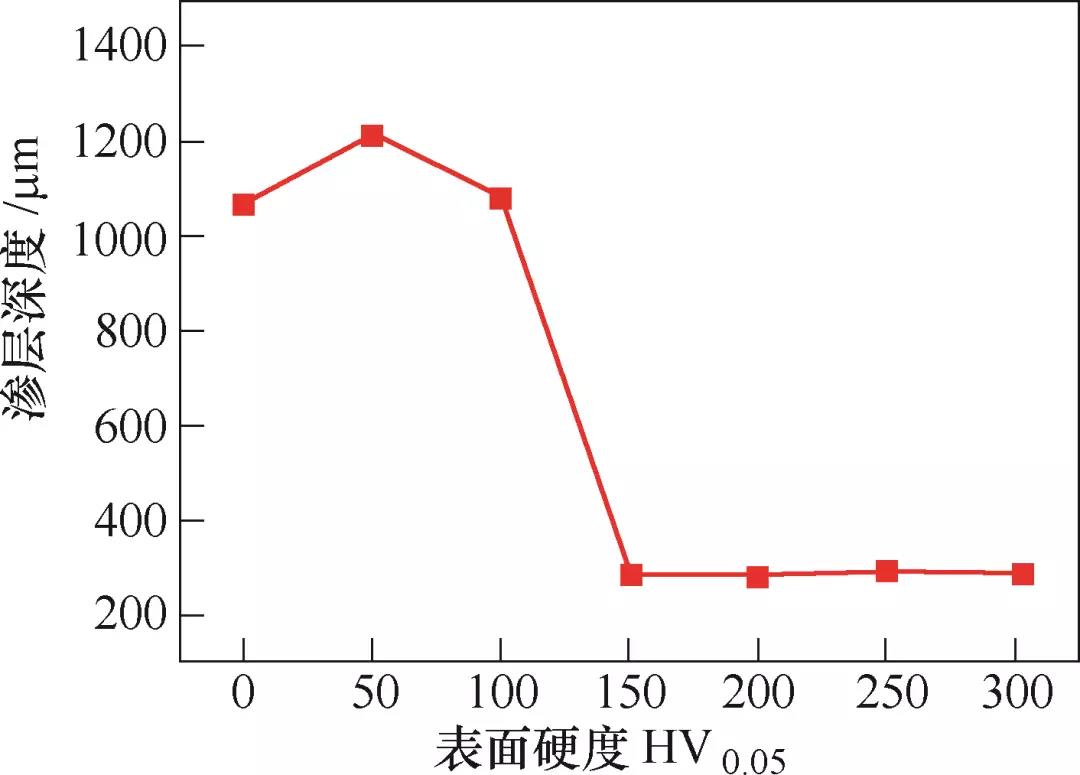 渗氮样品验证检测可知,渗氮层现分层现象,表层为白亮色,次表层颜色偏黑(见图4a)。其原因是表层单一的Fe的氮化物耐蚀性能要比次表层Cr、Fe氮化物混合相要强,再者大量的带状组织会降低其耐蚀性,所以腐蚀后表面呈现白亮色,次表面偏黑色。说明样品再次渗氮后其表面仍然存在贫铬现象。硬度曲线(图4b)表明其表面硬度明显低于次表面(渗氮层)的硬度,氮化层中Fe的氮化物硬度值要比次表层Cr的氮化物硬度值低,导致硬度曲线呈非梯度型。正常AISI 316L不锈钢氮化后表面硬度在1400HV0.05以上,且Cr的氮化物是提高表面硬度的主要原因,Cr含量不足,会使硬度值降低。再次氮化的搅齿表面硬度值偏低,在使用前需要对其进行机械磨磨屑,除去表层贫铬区17.33μm。