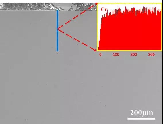对AISI 316L搅齿样品剖面进行EDS Cr元素线扫描分析(见图3),结果表明搅齿表面Cr含量比基体材料要低,即表面存在贫铬区,约17.33μm。不锈钢之所以性能好就是因为其含Cr量高,既可以自然钝化也可以人工钝化。不锈钢具有良好钝化性能低Cr的质量分数为12.7%,Cr含量低于此值其钝化性能性就会降低,耐蚀性也会随之降低。AISI 316L搅齿表面未形成氮化层和钝化膜是导致搅齿在安装过程中生锈的主要原因。