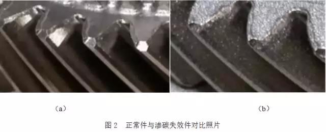 从图2中(右图为渗碳失效件强喷后齿面状态照片)的两张对比照片可看出,由于渗碳不均匀造成同一炉零件中同时出现合格件与渗碳失效件两种状态的零件。渗碳失效势必会影响到零件的使用性能,增加了质量风险。同时,生产制造企业以报废形式处理,这样一来势必导致生产成本的增加。