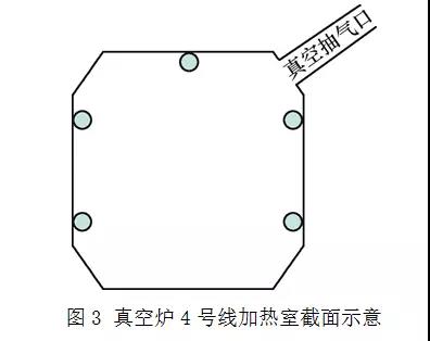 图3所示的加热室内部的真空抽气口与外部的真空生产线的真空泵连接,处于常开状态,其作用是维持加热室内的真空度,使加热室内的压力始终与主通道的压力保持平衡,所以其处于常开状态且为主动抽气方式。当加热室内通入渗碳气体时,加热室内的压力瞬间升高,为了维持真空度与压力平衡,真空泵的抽气功率也随之升高,加之真空抽气口处于打开的状态且排气管路是直通的,因此渗碳气体被地抽走,导致渗碳气体在加热室内还未均匀弥散且与加热室内的渗碳零件还未充分接触即被排出,从而造成加热室内局部区域的零件渗碳失效,出现渗碳不均匀的现象。