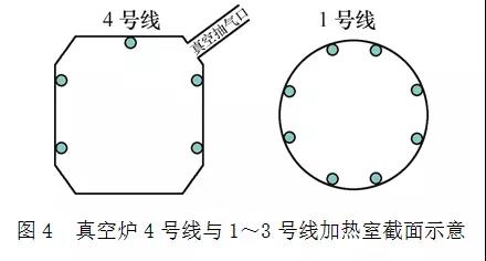 从图4中可看出,真空炉4号线加热室炉膛呈八边形结构,炉膛体积大于1~3号线,但渗碳气体喷嘴数量与另外三条线相同(4号线内共分布5排渗碳气体喷嘴,图中用圆点示意,每排8个喷嘴;1~3号线为8排×5个/排的分布方式),且喷嘴在炉膛内未均匀分布(图中圆点仅用来示意喷嘴位置分布,并非喷嘴本身的结构示意),炉膛底部无喷嘴分布。由于真空炉4号线加热室底部无渗碳气体喷嘴分布且炉膛体积也比1~3号线大,因此相同流量的渗碳气体在4号线加热室内的浓度势必比另外3条线低且分布不均匀,导致出现渗碳不均匀现象的风险增加。