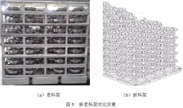 从图5中可看出新料架取消了挡边,且零件上下层是交错摆放的,大地了渗碳气体的流通性,使渗碳气体能够与料架上的零件接触充分,对渗碳均匀性有很大帮助。