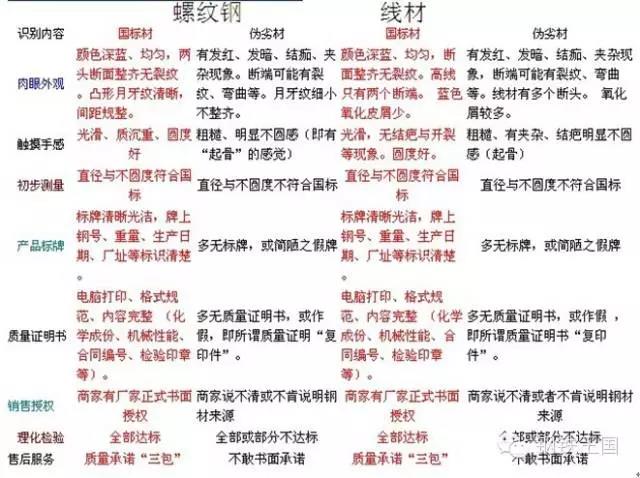3)化学成份不合格,多发生在小轧钢厂用土炼钢坯轧制的螺纹钢,原材料不合格所致。因此在购买时,首先从外观尺寸看,可用游标卡量具简单测量实际尺寸是否比名义尺寸(一般螺纹钢上均轧有规格标志)小约1个规格左右或多(如φ12螺纹钢标准内径为11.5±0.4mm,而伪劣螺纹钢内径大多为10mm左右)。同时有些伪劣螺纹钢通过轧扁的方式来欺骗人的视觉,从钢筋端面观察其为扁椭圆形,而正规材端面应基本为圆形。其二从表面质量看,由于伪劣钢材常带有结疤等缺陷,有整体粗糙感,表面颜色偏红。其三正规钢材出厂时往往是大捆包装,均挂有金属标牌,标明产家、钢材牌号、批号、规格及检验代号等。而伪劣钢筋大多小捆(十根左右捆扎)包装或散装,无金属标牌、无书。钢筋内在质量,即其强度、冷弯化学成份等理化性能,则只能通过取样检验方可判定。