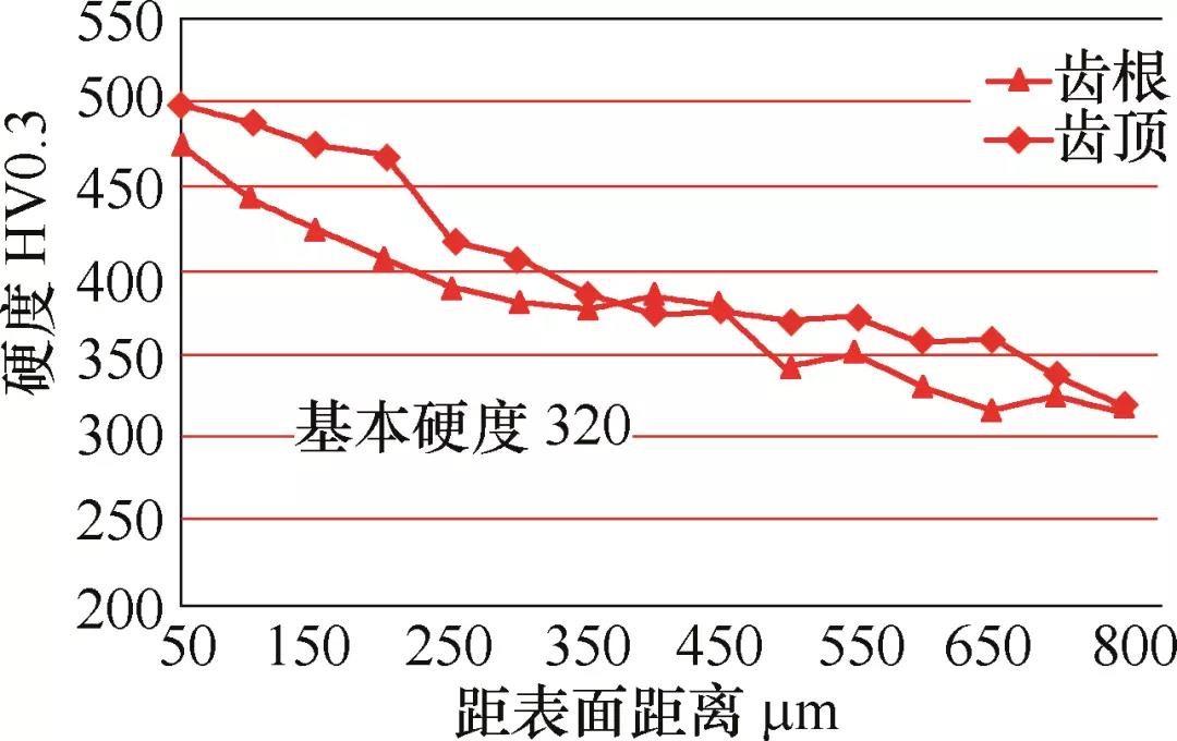 图4 齿顶、齿根渗氮层硬度梯度